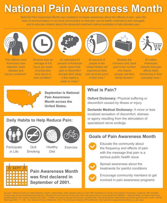 September is Pain Awareness Month! At National Spine & Pain Centers, we firmly believe in top-notch education about the pain management specialty and we also value the importance of shedding light on the prevalence of acute and chronic pain across America. Below, we have compiled key pain stats and also wish to share this infographic about Pain Awareness Month.